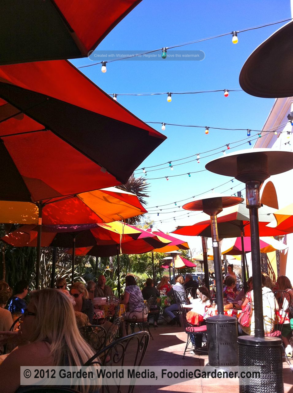 Lush, tall shade trees and multi-colored umbrellas filtered the bright, Southern California sun and the sound of the water fountain was soothing in the background.